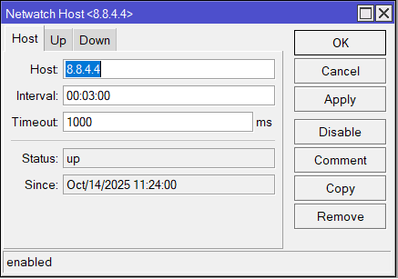 As imagens acima mostra visivelmente a configuração de monitoramento de links usando netwatch mikrotik. Rota 8.8.4.4 está sendo monitorada, se houver queda de link ou percas de pacotes muito alta netwatch executara os scripts de UP e DOWN.