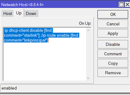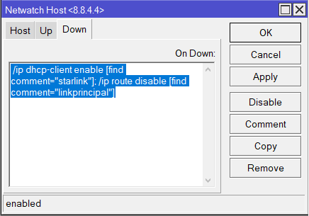 /ip dhcp-client enable [find comment=”starlink”]; /ip route disable [find comment=”linkprincipal”]
