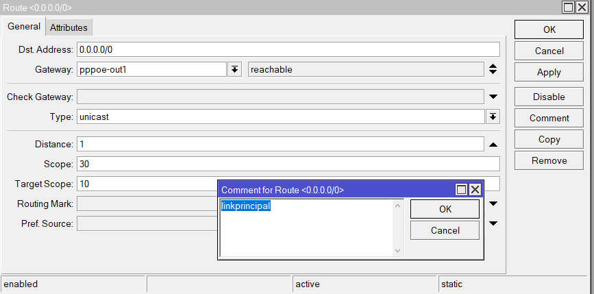 /ip dhcp-client disable [find comment=”starlink”]; /ip route enable [find comment=”linkprincipal”]